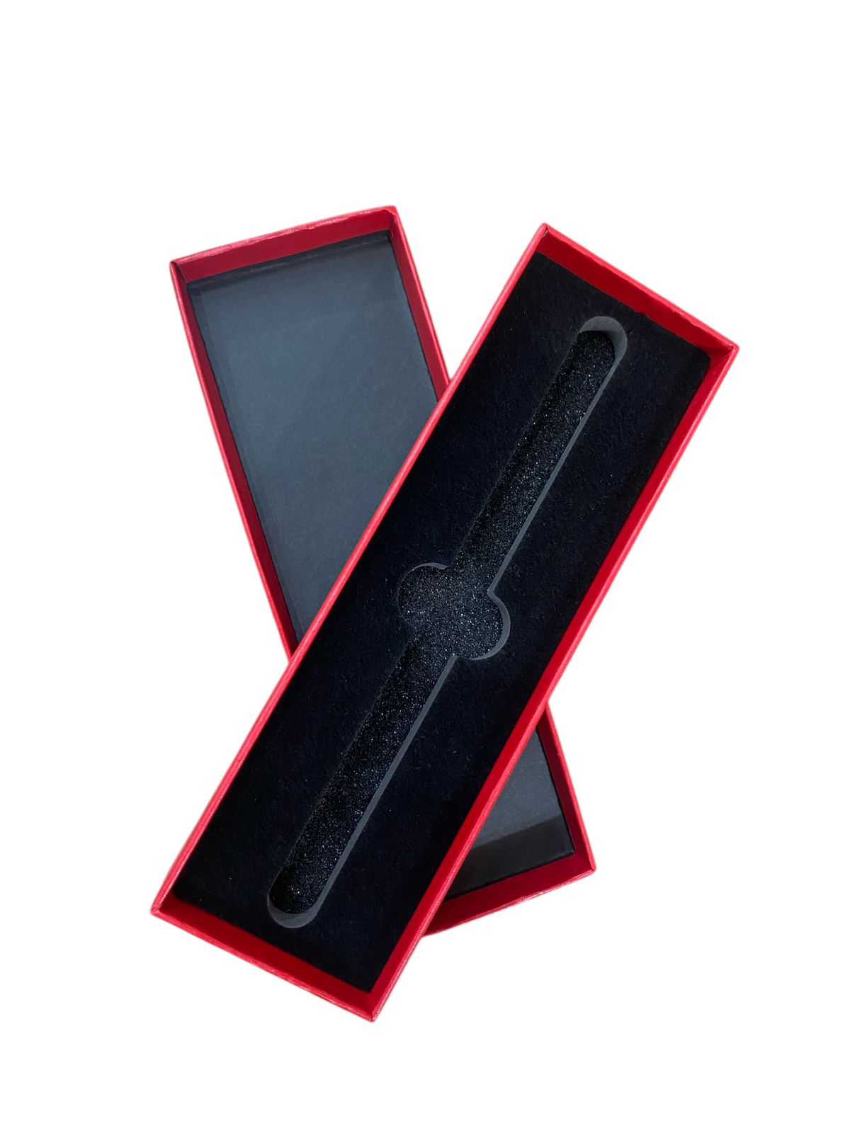 Descrição: Estojo em papelão e revestimento removível de duas camadas em espuma com espaço para guardar uma caneta ou lapiseira.
