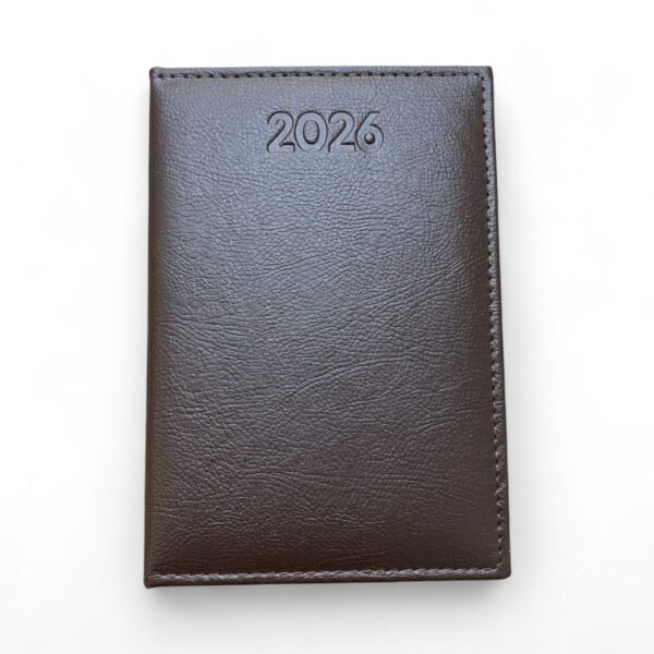 Agenda diária 2026 com capa em couro sintético e marca-páginas em fita de cetim. Contém páginas dedicadas para dados pessoais, calendários de 2025 a 2027, lista de contatos, planejamento e mapas.