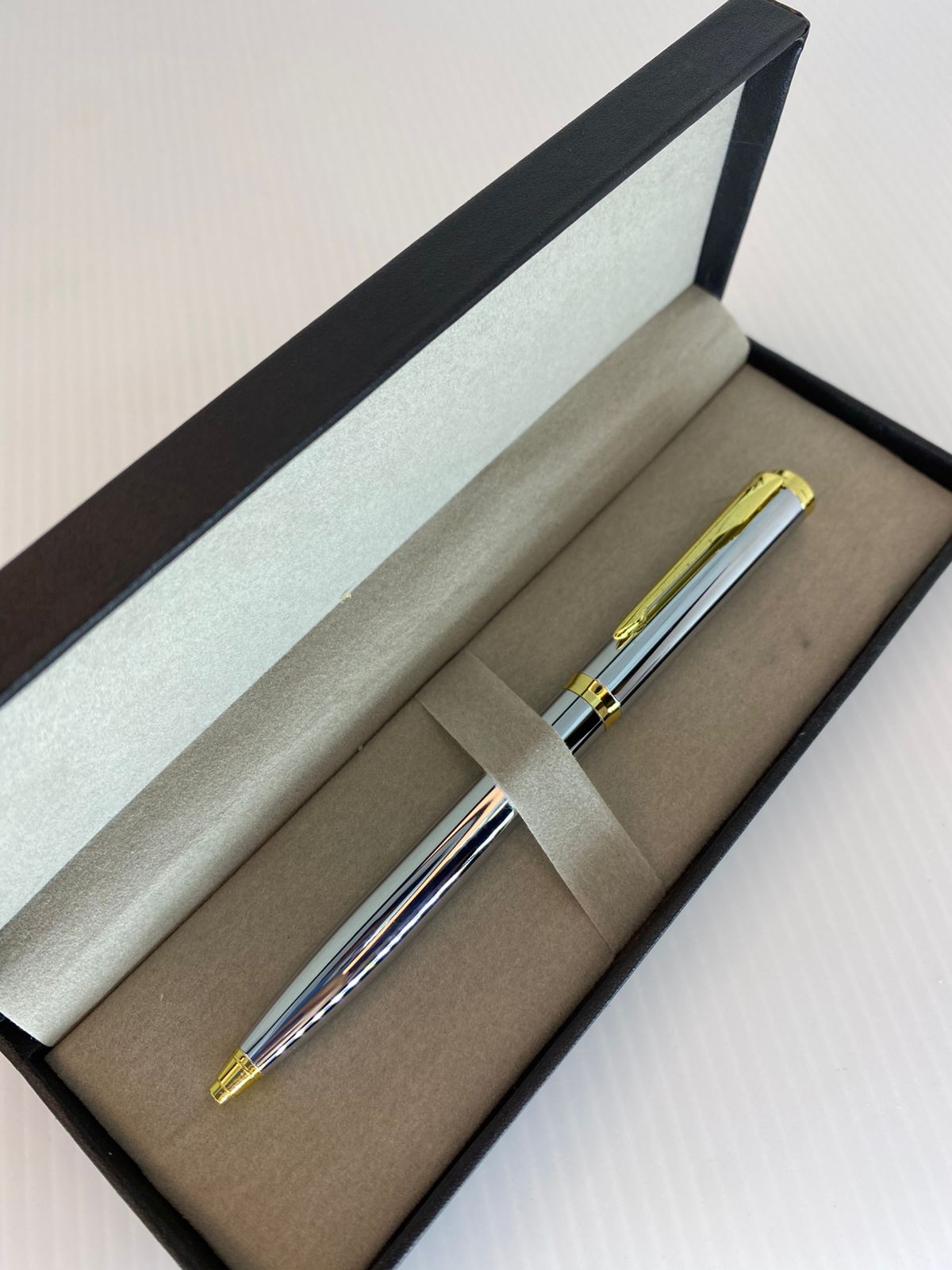 Caneta de metal esferográfica prata, com detalhes em dourado.