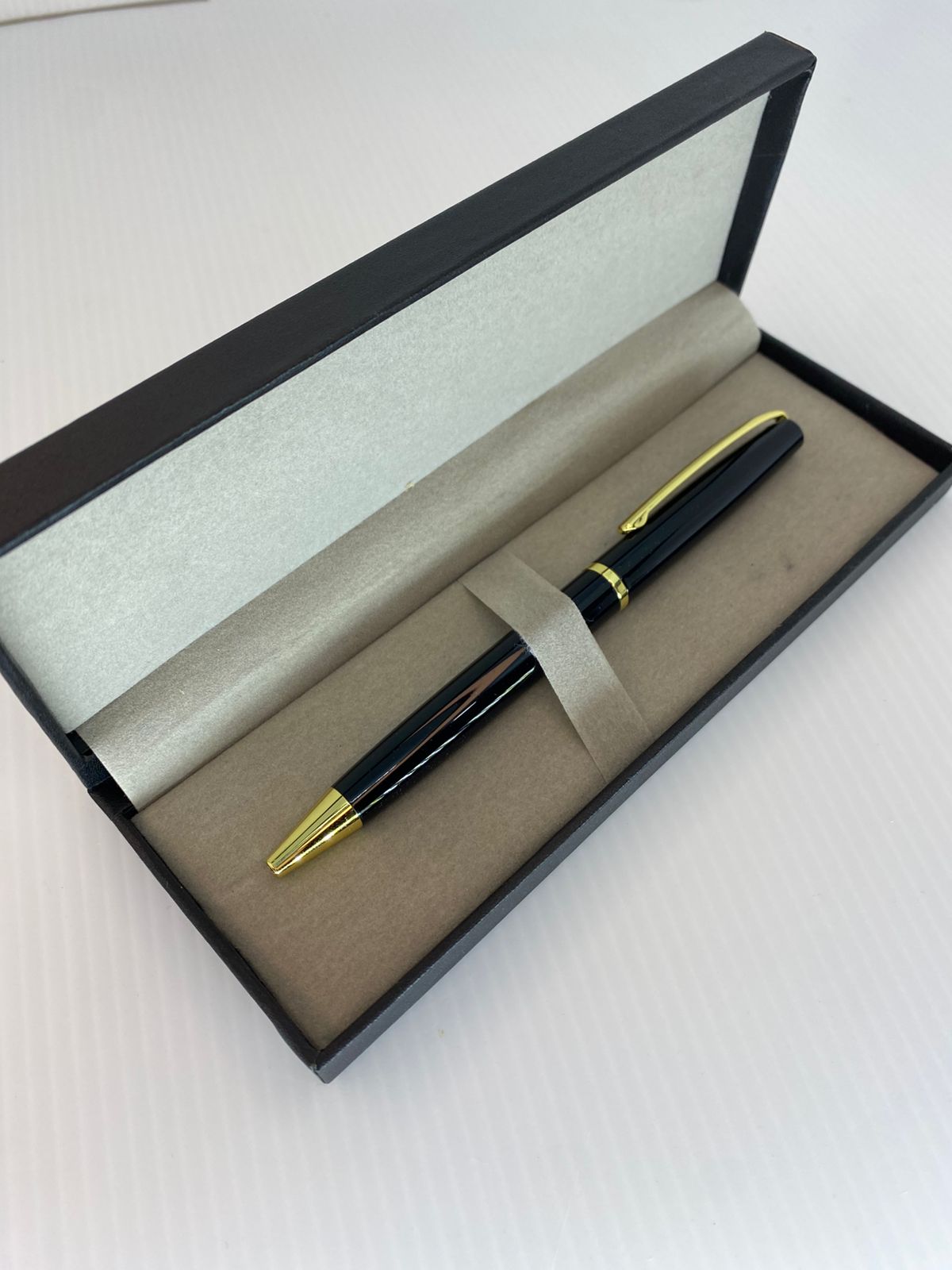 Estojo de metal esmaltado para duas canetas com parte interna revestida de espuma.
