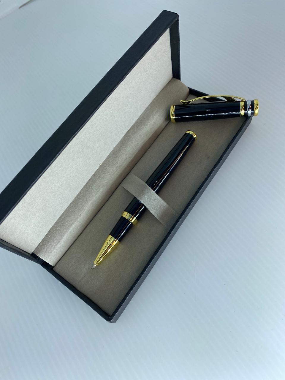 Caneta metálica Rollerball com tampa. Detalhes em dourado.